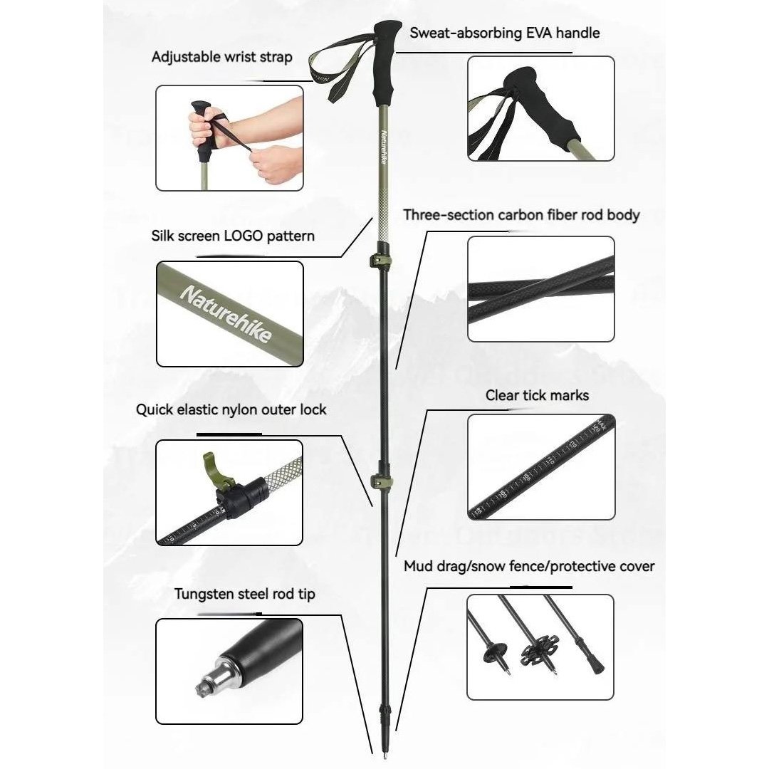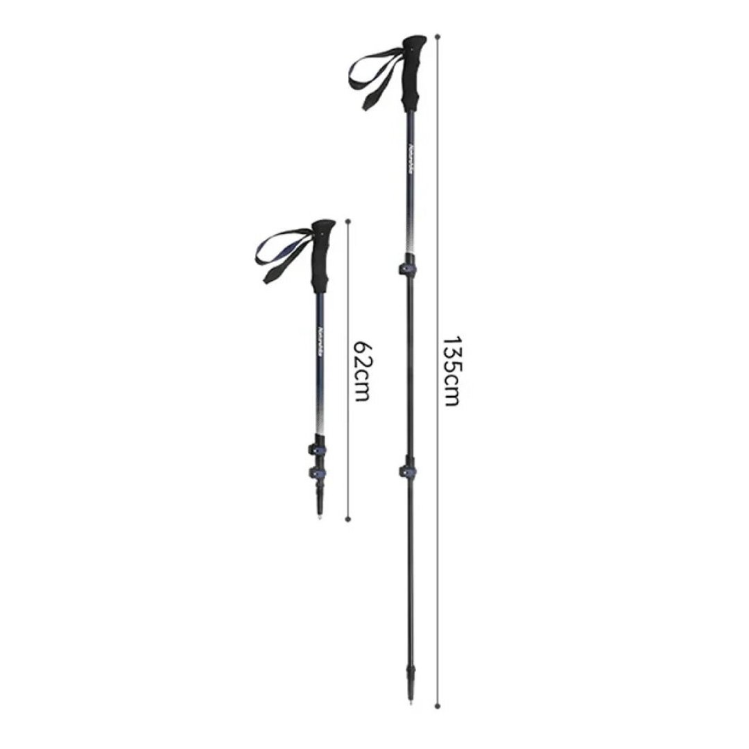 - El bastón de trekking de fibra de carbono Explorer de Naturehike es telescópico y está hecho de fibra de carbono que permite que sea ultraligero, pero lo suficientemente fuerte para soportar la presión y el impacto de cualquier terreno.