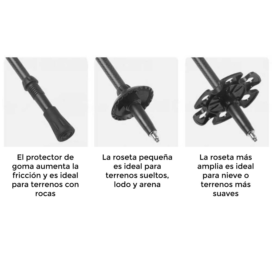 - Incluye un juego de rosetas y una punta de goma para terrenos regulares, nieve, lodo y rocas. Las rosetas evitan que el bastón se hunda en el terreno y las puntas de goma aumentan la superficie de contacto del bastón con el suelo, protegen la punta del mismo, y disminuyen las vibraciones del bastón hacia los brazos.