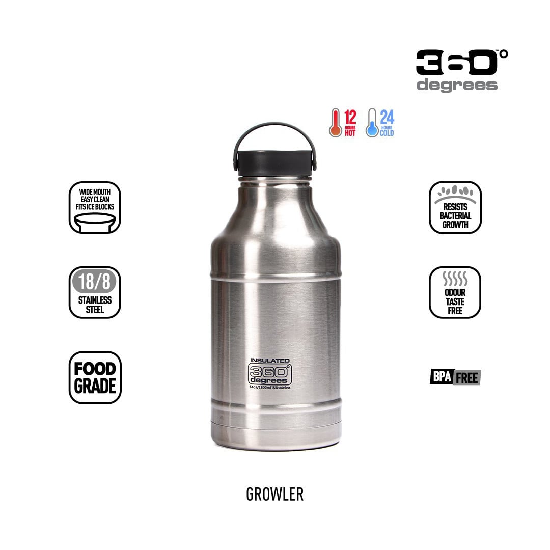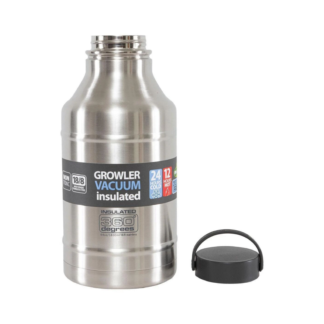 El Growler de doble pared 1.8L es una botella de gran tamaño que mantiene la temperatura y carbonatación original de tus bebidas durante horas. Está fabricado con acero inoxidable 18/8 duradero y apto para uso alimentario. También puede servir también como termo para sopa caliente para grupos.