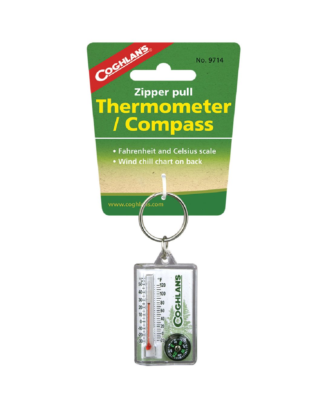 Esta combinación de Brújula con termómetro de Coghlan’s incluye escalas de ° F y ° C y cuenta con un gráfico de sensación térmica en la parte posterior.