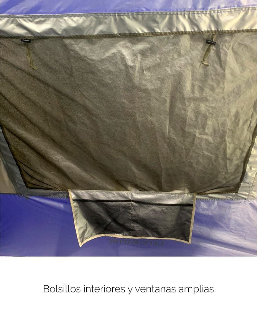 - El sobre techo está elaborado con tela Oxford de doble capa y posee un índice de impermeabilidad de 1500mm columnas de agua. Además, cuenta con protección UV.