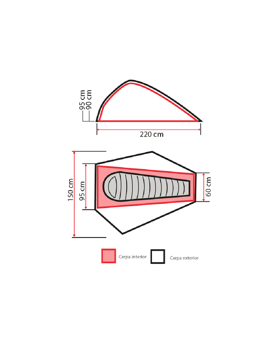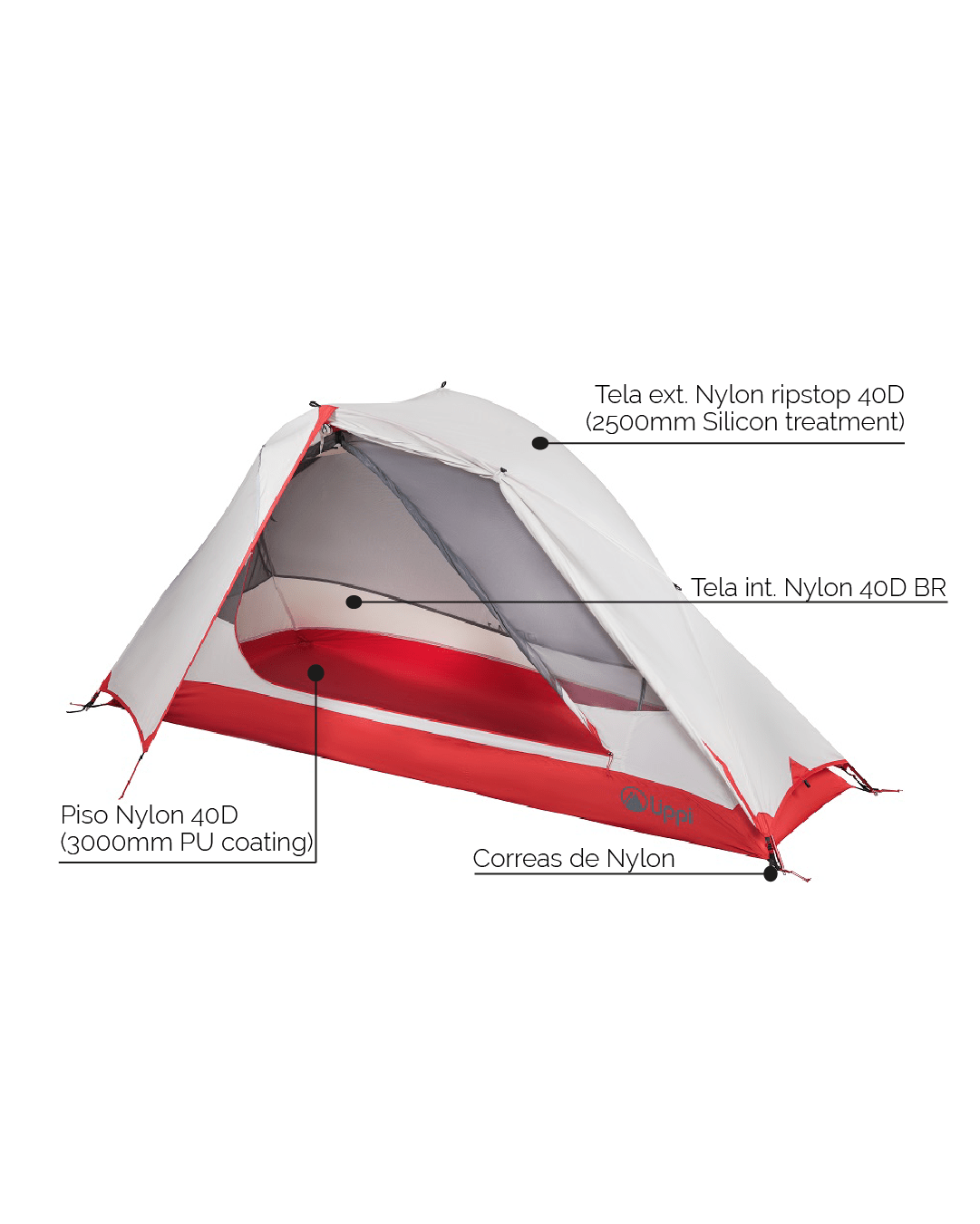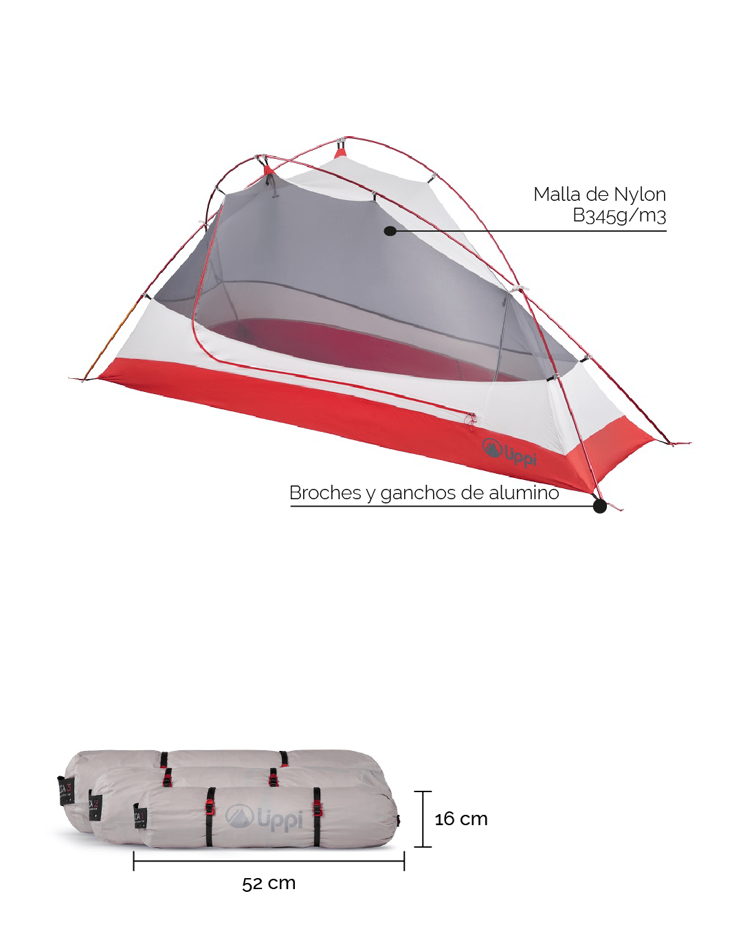 - El sobre techo de la carpa para una persona Roca I está elaborado con Nylon RipStop 40D y revestimiento de Silicona con índice de impermeabilidad de 2500mm.