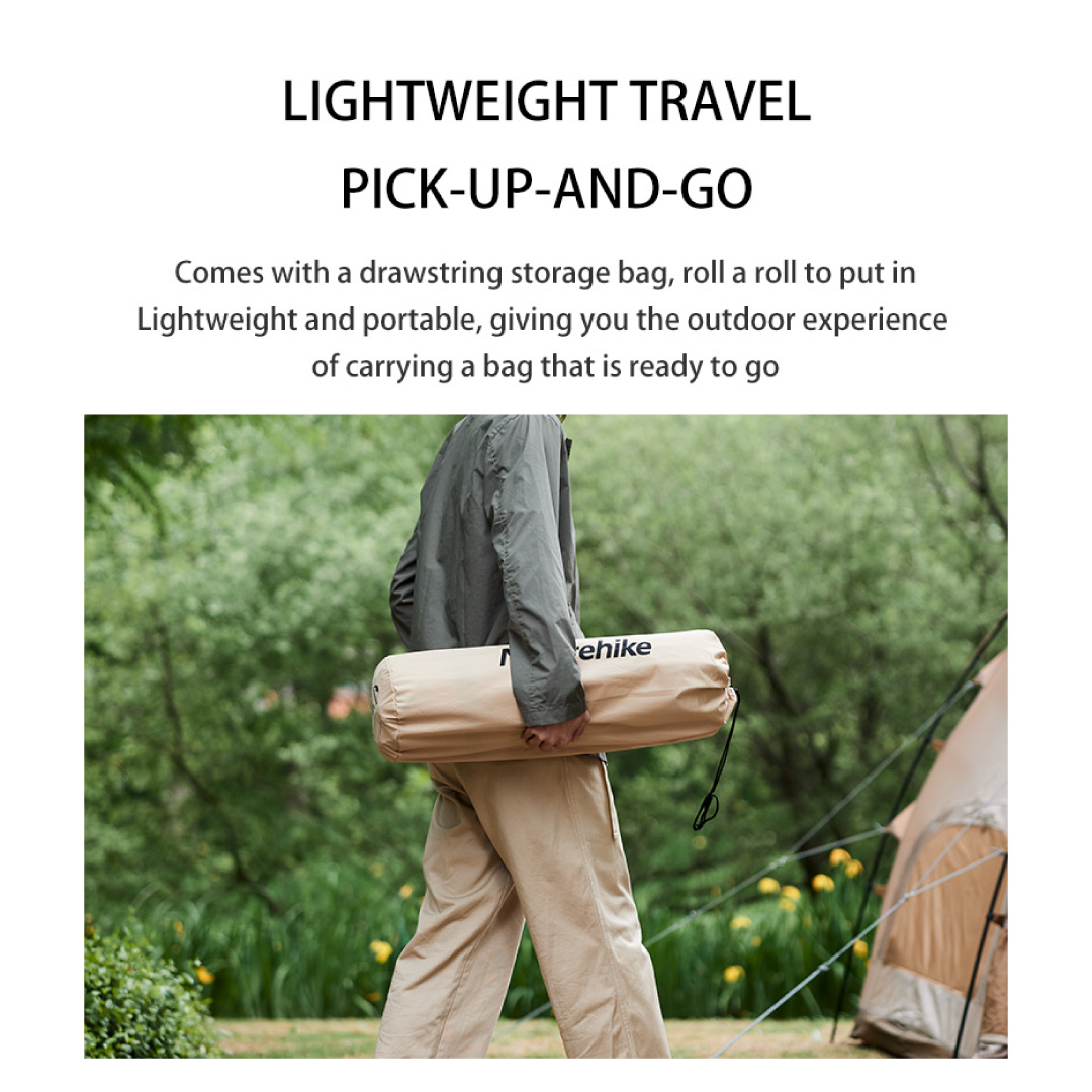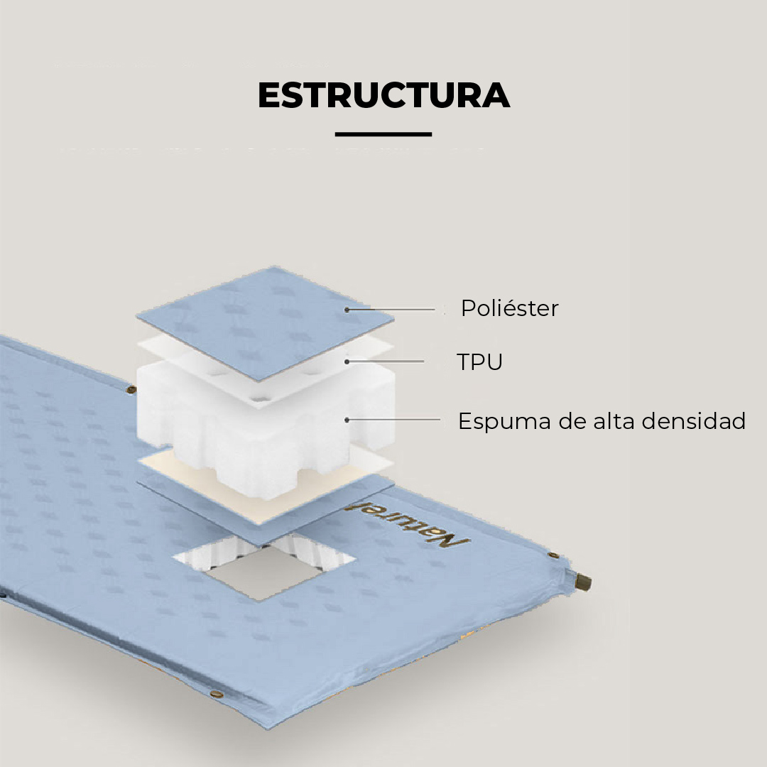 - La colchoneta autoinflable doble con almohadas D01 de Naturehike consta de dos materiales principales: la tela y esponja. La tela es fabricada de nylon 190T con resistencia al agua y de fácil limpieza. Además, tiene un revestimiento de Policloruro de vinilo (PVC), lo que proporciona una mejor elasticidad y resistencia al calor.