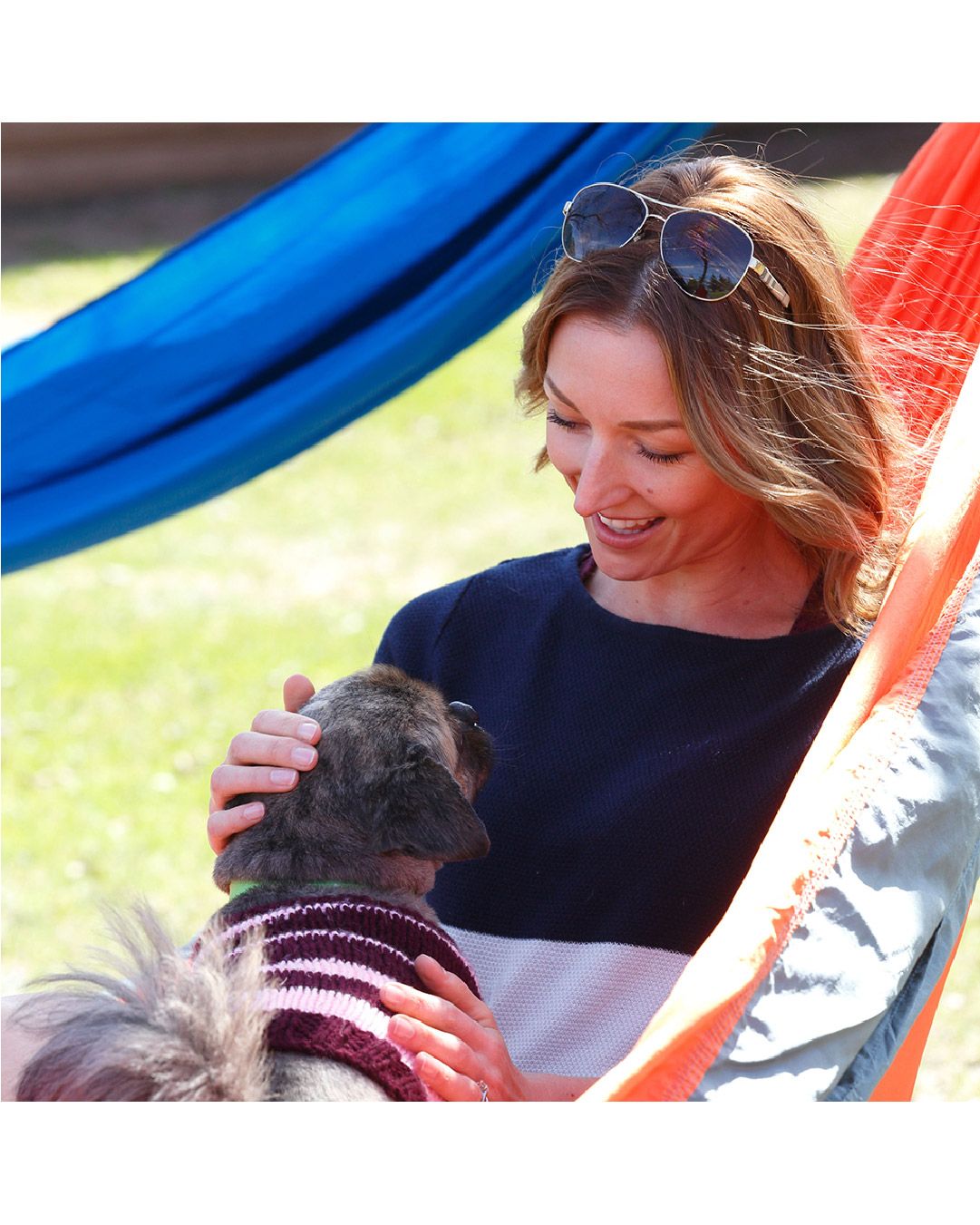 - Esta hamaca para dos personas está hecha de nylon 70D con costuras triples para garantizar su durabilidad.