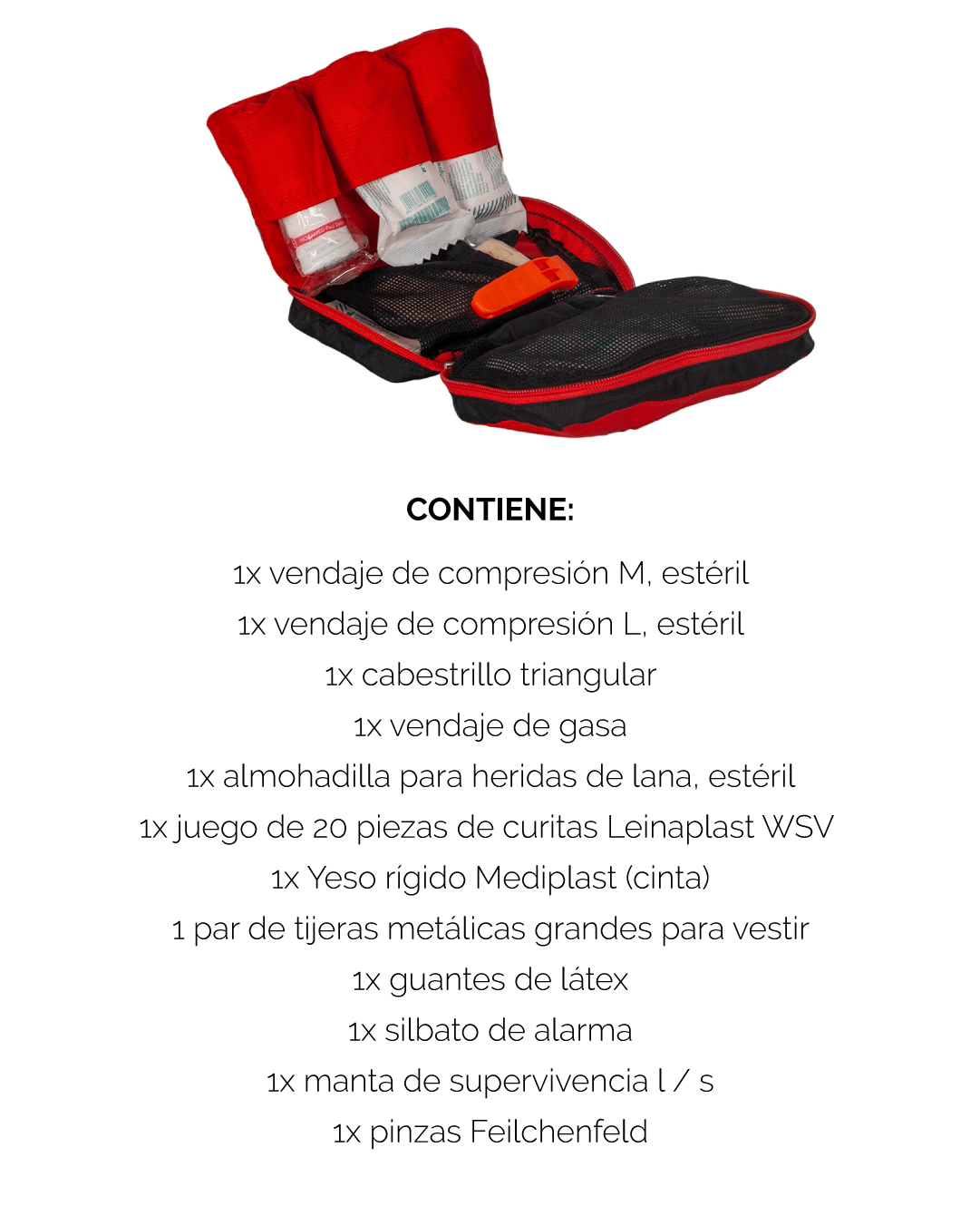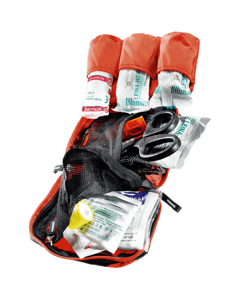 El Kit primeros auxilios de Deuter cubre las necesidades básicas de acuerdo con las recomendaciones médicas. También se puede utilizar para administrar primeros auxilios en heridas más grandes. Incluye vendajes, pinzas e instrucciones sobre cómo cuidar a los pacientes lesionados.