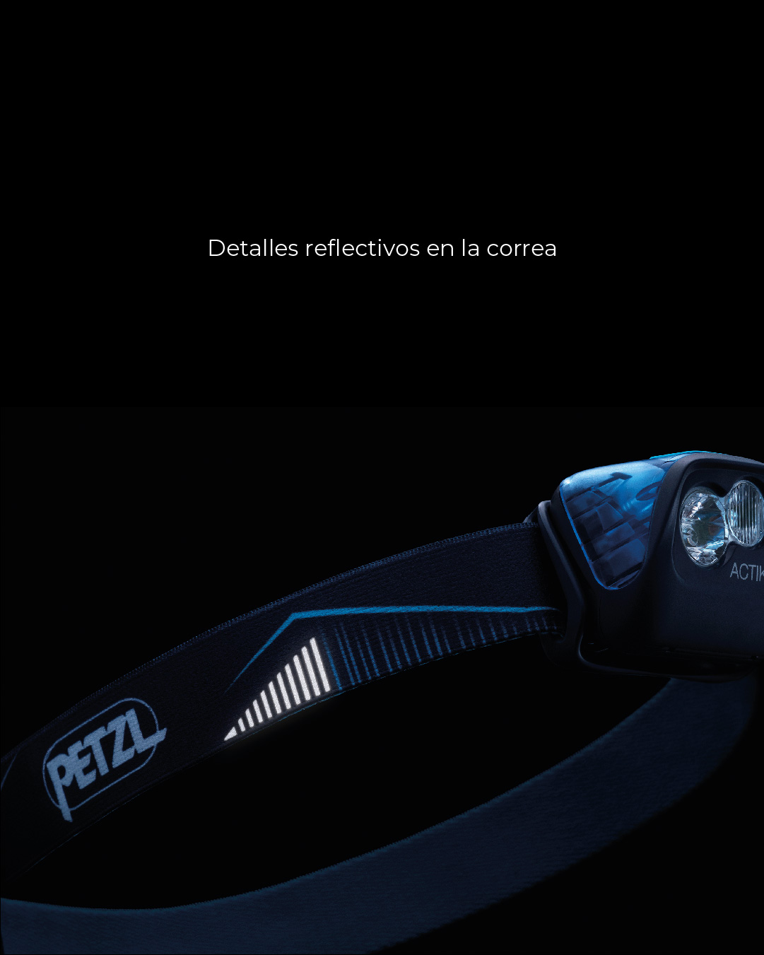 - La Linterna frontal outdoor Actik de Petzl tiene dos tipos de haces luminosos (amplio o mixto) y varios niveles de iluminación blanca que responden a las necesidades de una iluminación eficiente para las actividades outdoor dinámicas: visión de proximidad o de lejos y desplazamientos rápidos.