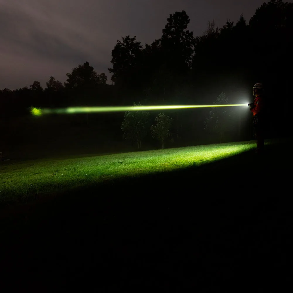 - Su diseño innovador combina una luz COB blanca/roja con un módulo de iluminación por láser (LEP) para lograr una distancia de haz increíble y un útil patrón de inundación de dos colores para usar a corta distancia.