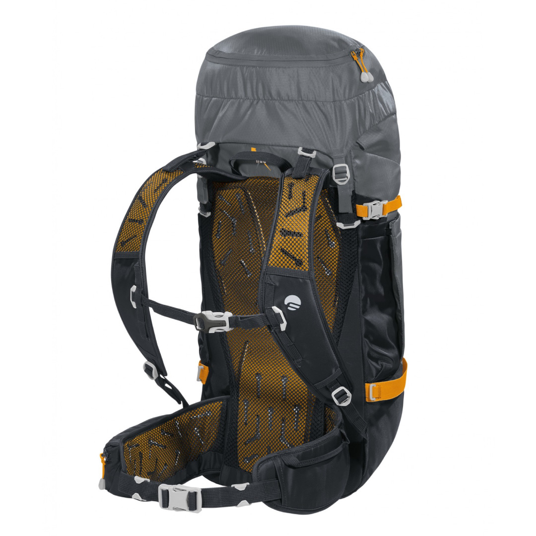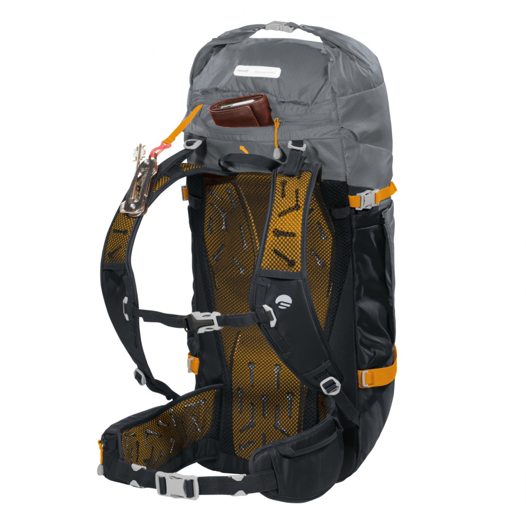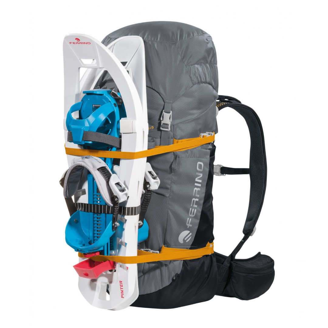 - La mochila alpina Triolet 32+5L de Ferrino posee un espaldar con el “Hollow back system”, que consiste en tirantes y cinturón transpirables gracias a la combinación de rellenos preformados con canales de ventilación y un tejido reticular muy transpirable.