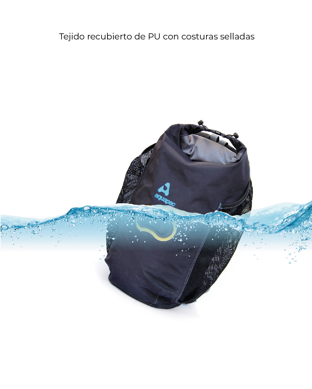 - La Mochila 100% waterproof 25L de Aquapac es 100% libre de PVC por lo que se mantiene flexible y sin grietas incluso cuando hace mucho frío. Además, tiene un recubrimiento de poliuretano (PU) con costuras selladas.
