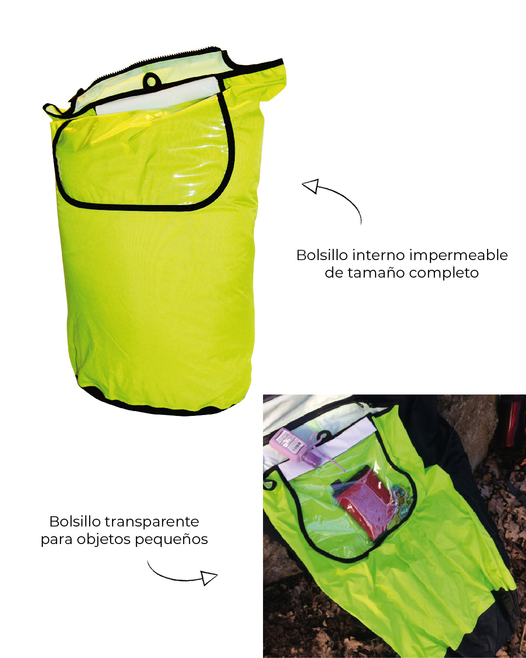 - Tiene un bolsillo interno impermeable de tamaño completo que te permite separar tus cosas húmedas y secas guardadas de manera segura en la misma mochila.