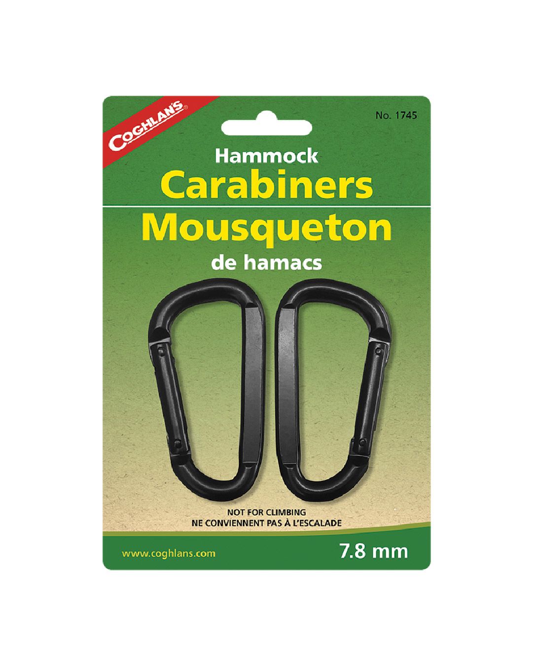 Los mosquetones para hamaca de la marca Coghlan’s son los mismos que vienen incluidos con las hamacas para dos personas y las hamacas individuales. Son capaces de soportar 500 kg. Puedes utilizarlos con hamacas, pero también como mosquetones convencionales de mayor resistencia para colgar o enganchar otros artículos.