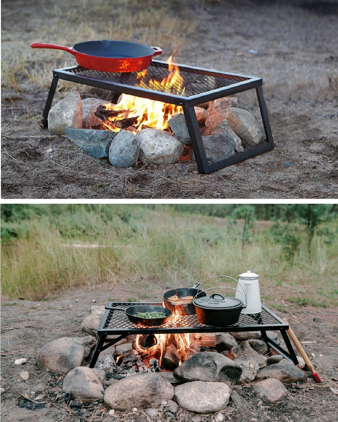Esta parrilla portátil ha sido diseñada para utilizarse con ollas y sartenes de hierro fundido. Tiene una estructura metálica robusta y una rejilla de hierro para mantenerse siempre estable. No está diseñada para cocinar alimentos directamente sobre ella.