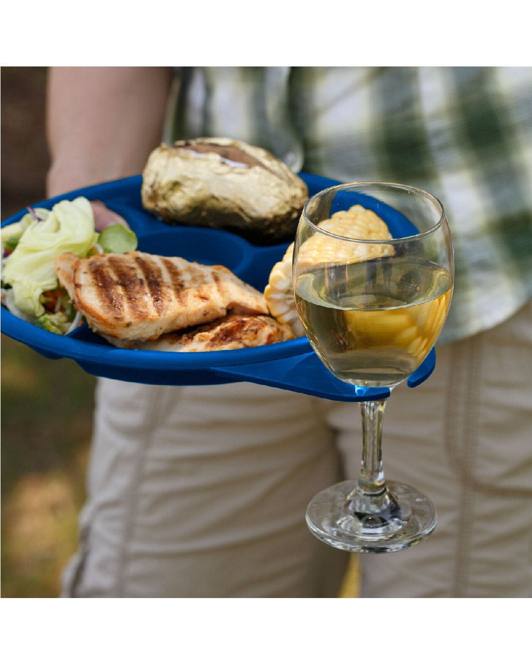 El plato de picnic de la marca Coghlan’s está hecho de polipropileno libre de BPA. Está diseñado para contener alimentos y bebidas simultáneamente, e incluso tiene una ranura para sostener una copa de vino.