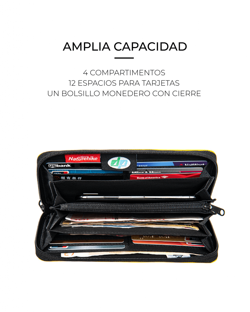 - Cuenta con cuatro (04) divisiones, doce (12) bolsillos porta-tarjetas y un (01) bolsillo con cierre.