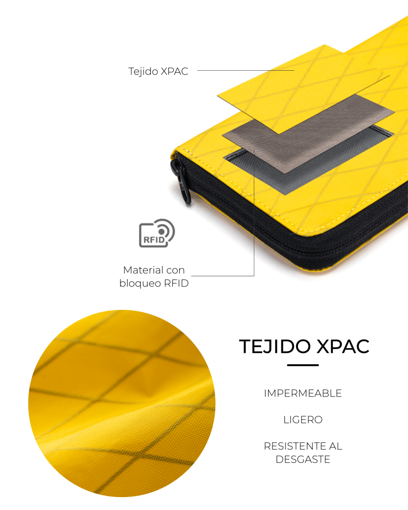 Con el Porta pasaporte RFID impermeable tus documentos estarán protegidos. No solo por su impermeabilidad gracias a su tejido X-Pac ™, sino a su sistema de bloqueo antirrobo RFID. Además, sus diversos compartimentos y porta-tarjetas te permitirán tener todo organizado.