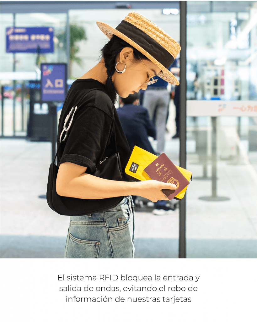 - Este porta pasaporte impermeable tiene el sistema de bloqueo antirrobo RFID.