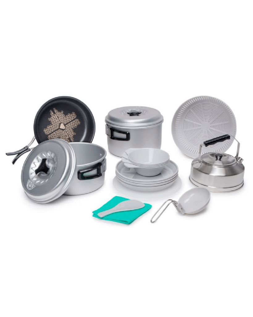 El set de ollas para 4 personas de Doite es un juego completo de cocina, con todo lo necesario para cocinar en una travesía. Es ligero, compacto y con sistema antiadherente que facilita la limpieza y evita que los alimentos se peguen. Incluye un total de 17 piezas.