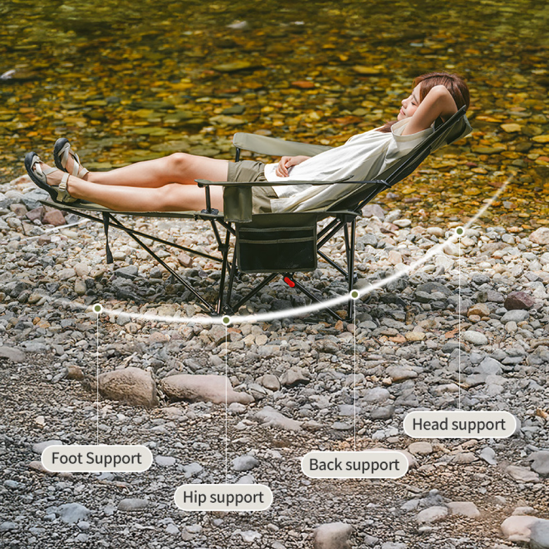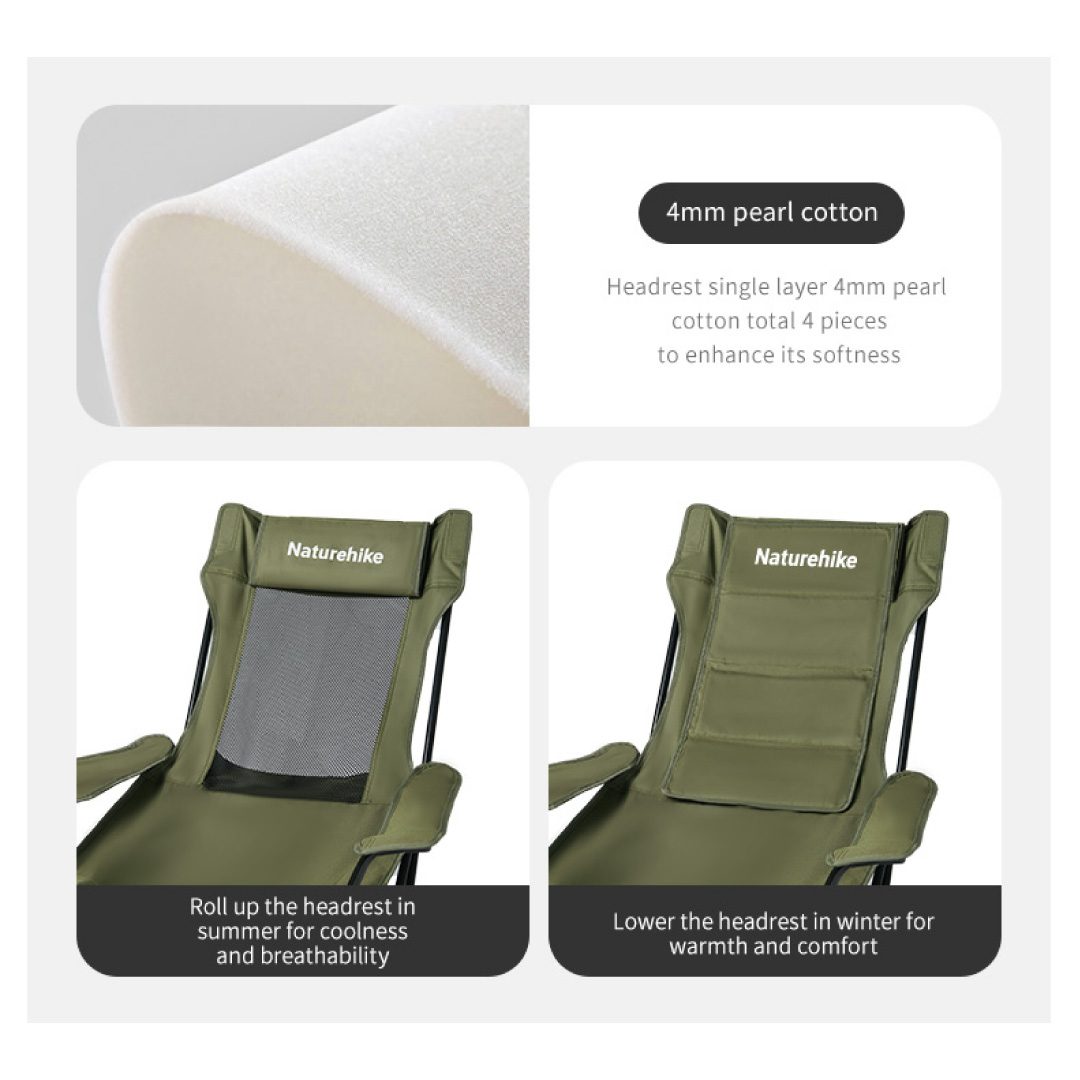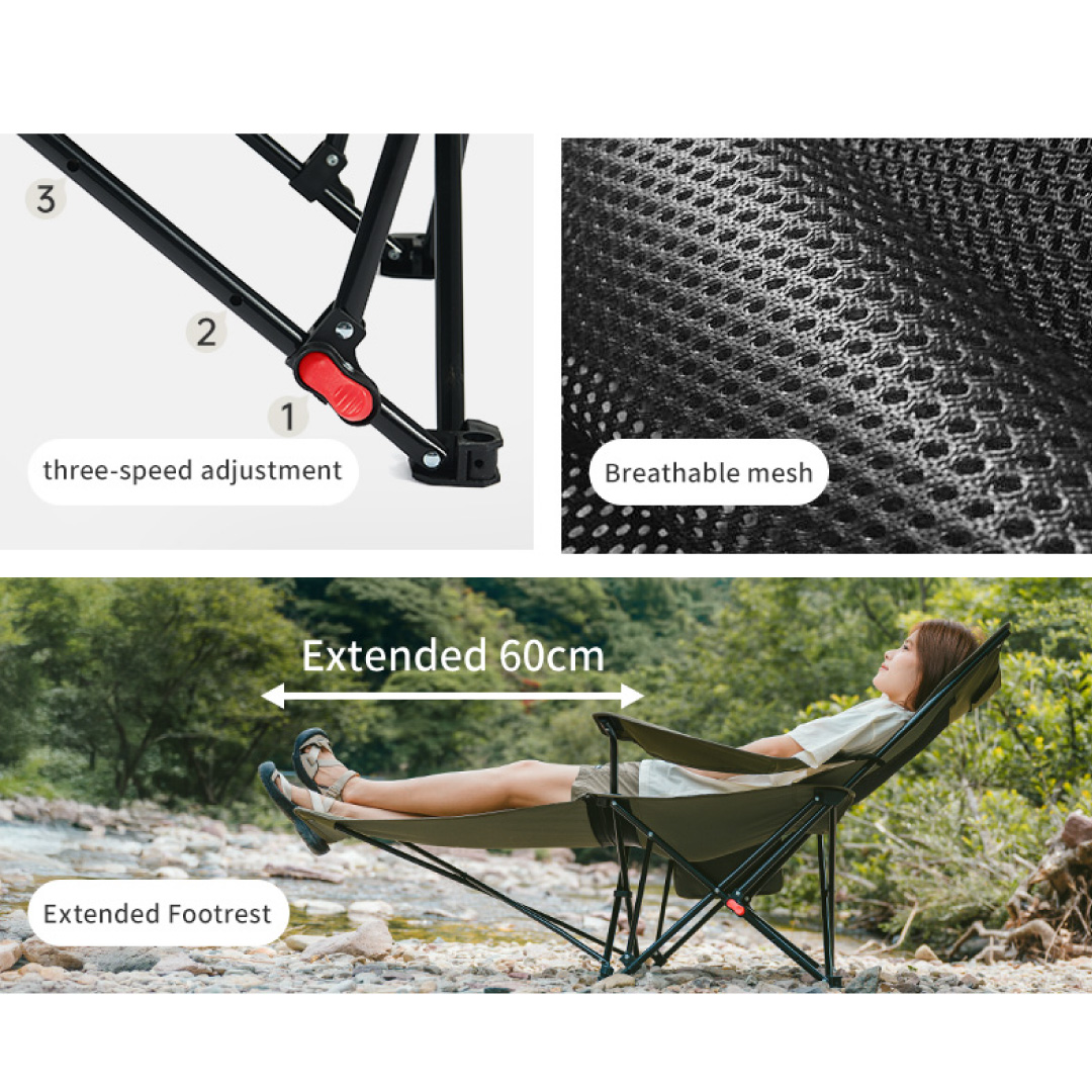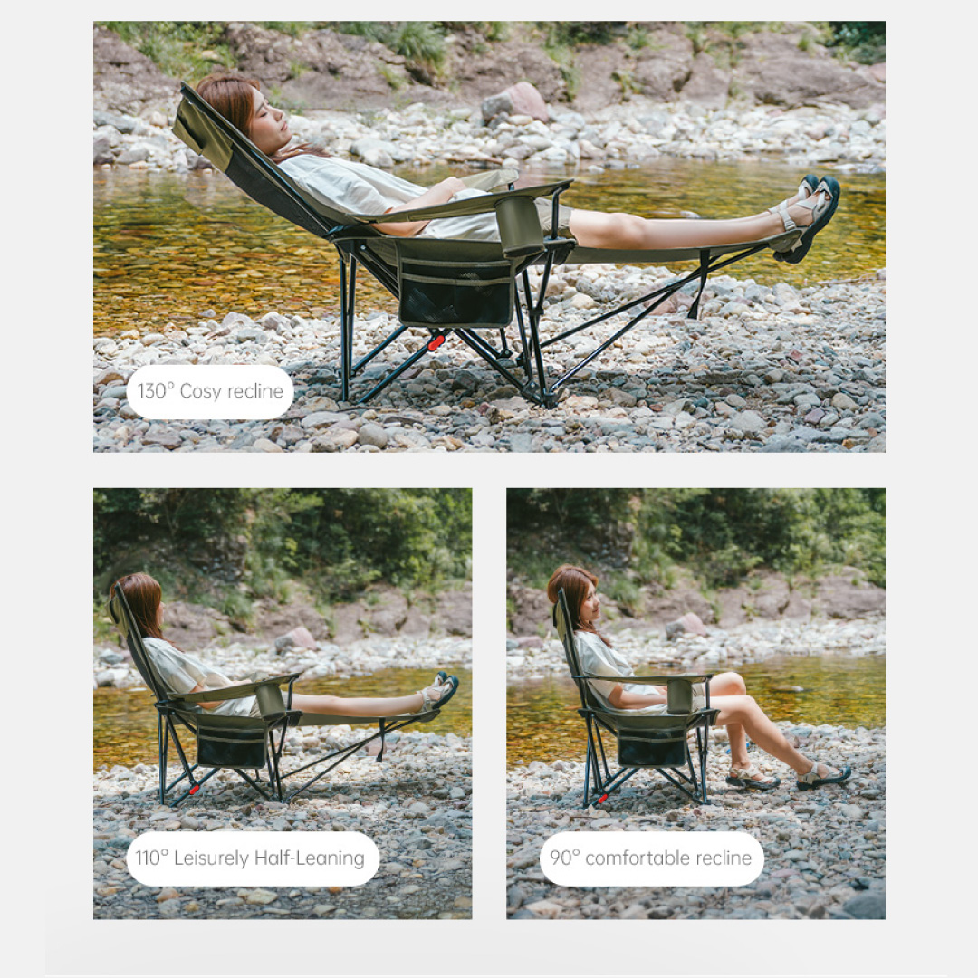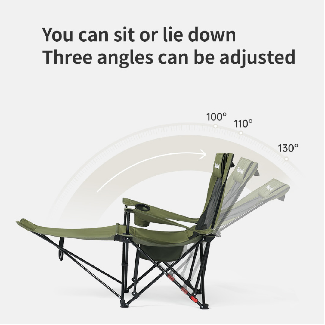 - La silla plegable y reclinable Nightfall T05 de Naturehike cuenta con un mecanismo de ajuste que permite seleccionar un ángulo de reclinación de 100° para sentarse y charlar, 110° para relajarse semi-reclinado y 130° para relajarse completamente después de actividades al aire libre.