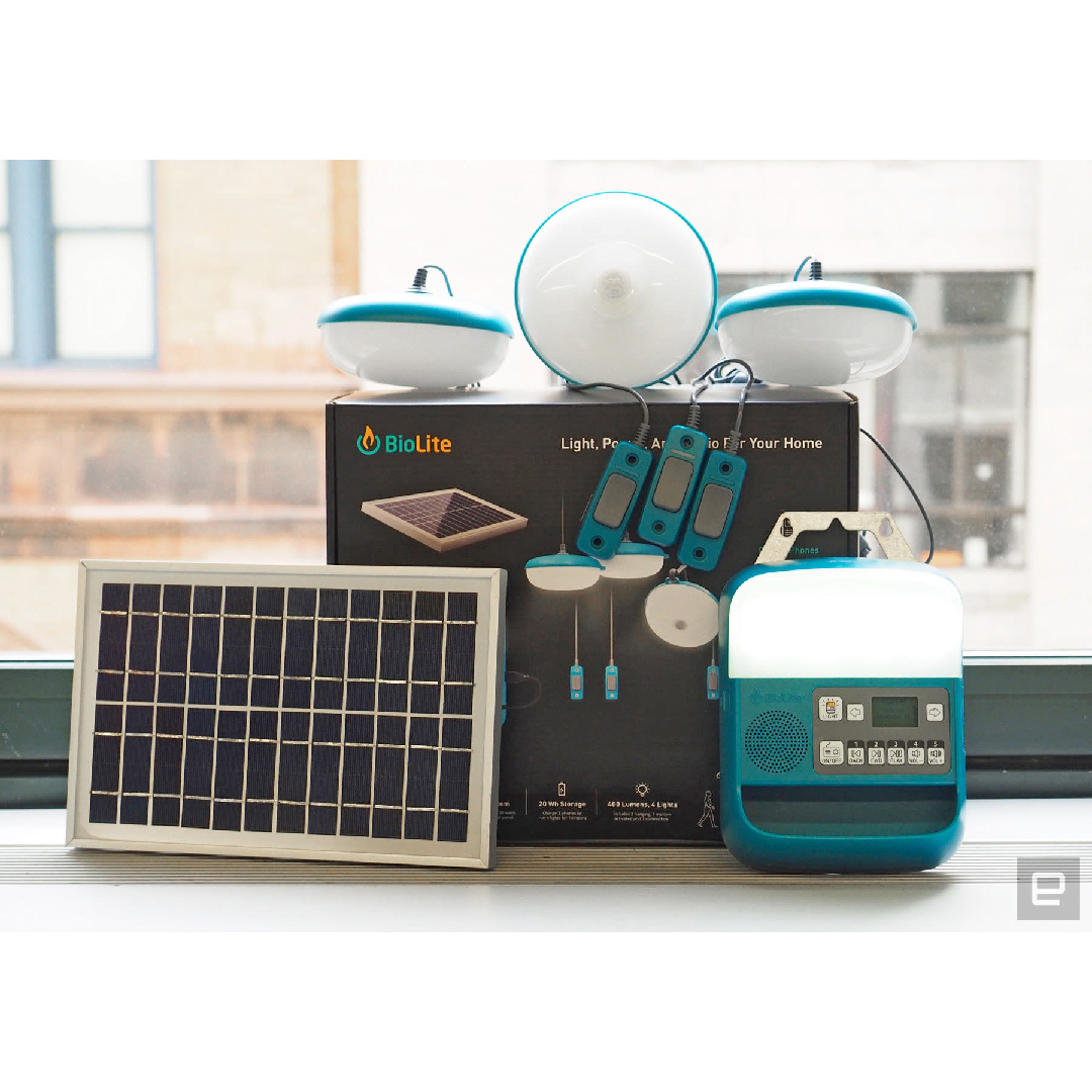 El sistema de iluminación SolarHome 620 de Biolite es un sistema solar doméstico que puede proporcionar energía y luz a cualquier vivienda pequeña o campamento sin conexión a la red. Incluye un panel solar, una caja de control y luces con sus interruptores y hasta un sensor de movimiento. La caja de control integra una cuarta luz y ofrece retroalimentación de energía en tiempo real, mp3/radio y una salida USB para cargar dispositivos.
