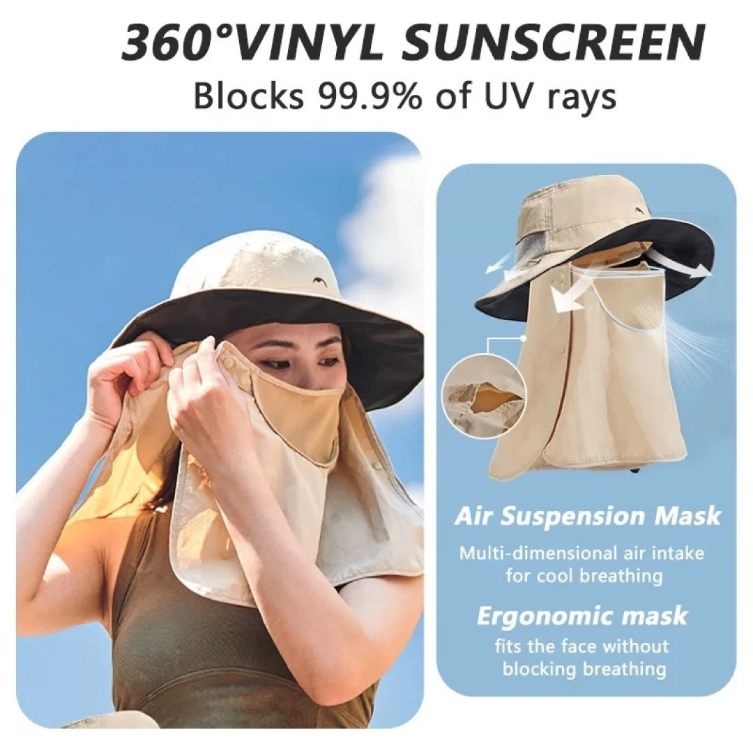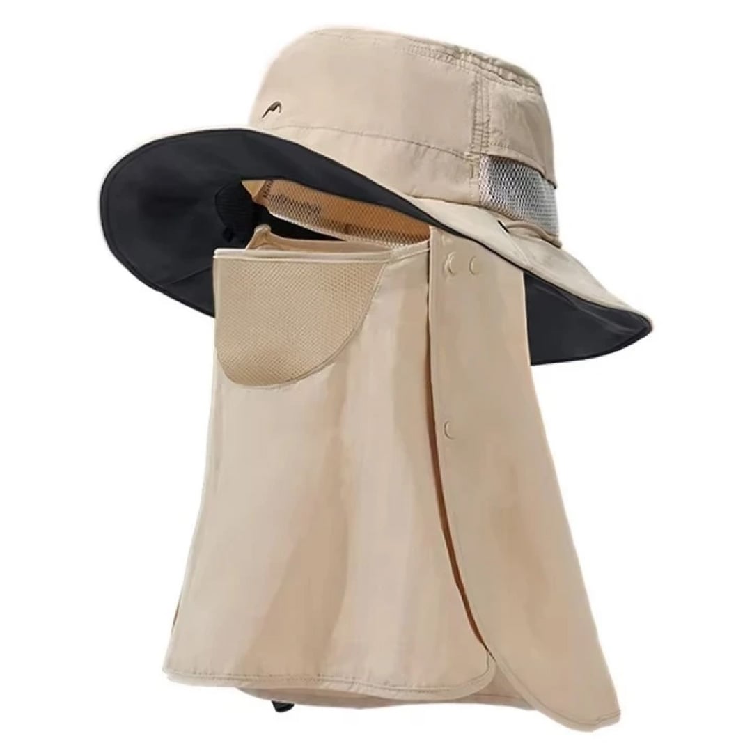 - Su diseño ofrece protección solar 360° gracias a su ala ancha, cobertura adicional en la nuca y cubierta facial. Estas cubiertas son desmontables para que puedas usarlas según tu comodidad y requerimiento.