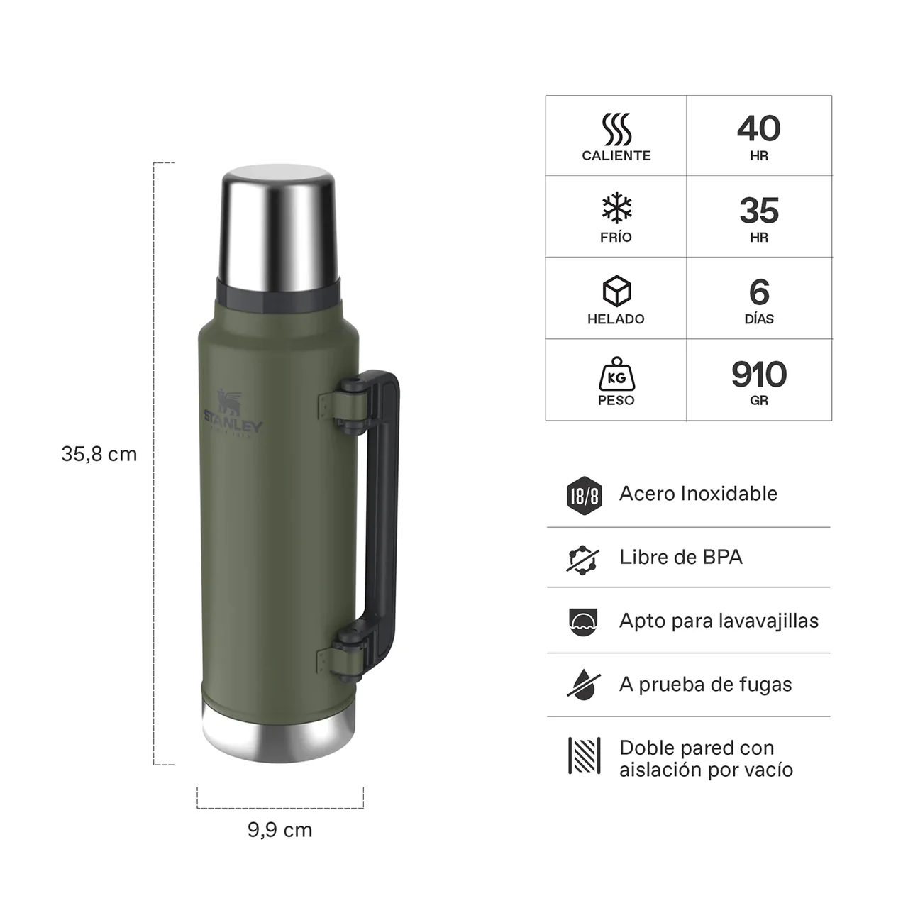 - El Termo Stanley Classic 1.4 Lt está hecho de acero inoxidable 18/8; libre de BPA.