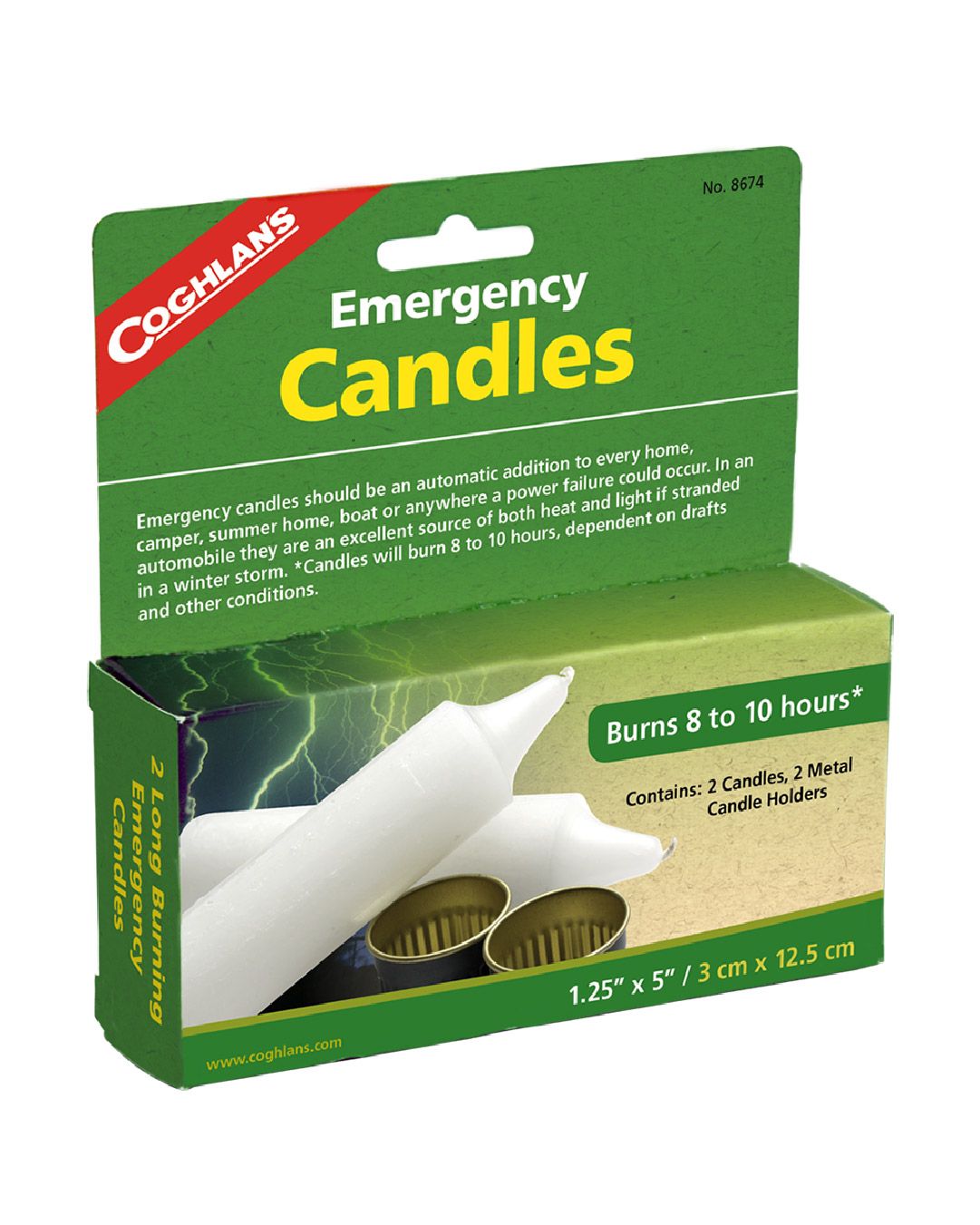 - Las Velas de emergencia (x2) de Coghlan’S son de larga duración para situaciones de emergencia.