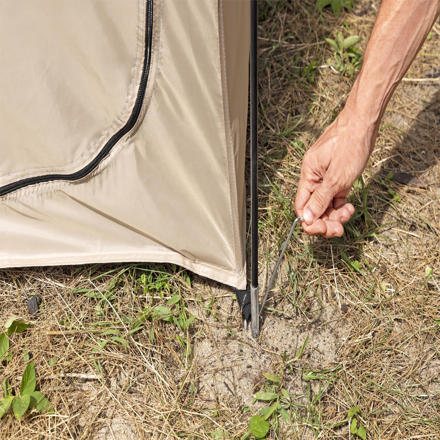 Este vestidor portátil ha sido diseñado para brindarte mayor privacidad al vestirte o ducharte en lugares como la playa o zonas de camping. Tiene dos ventanas para que superiores para que circule el aire y cuenta con un suelo desmontable para escurrir el agua en caso se utilice como ducha.