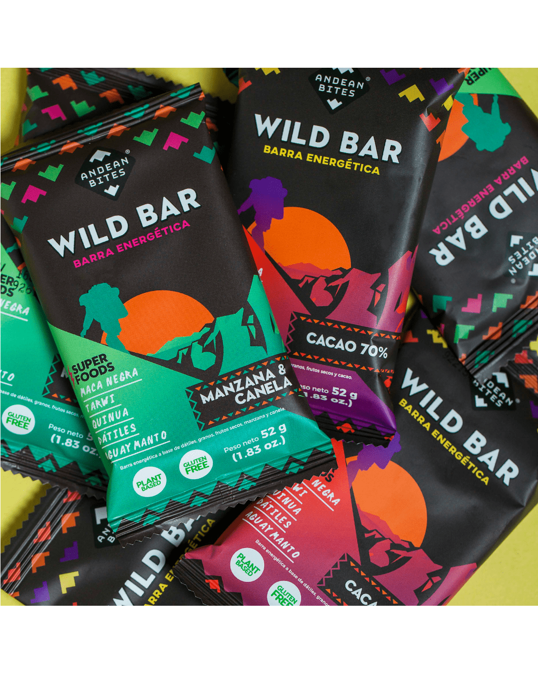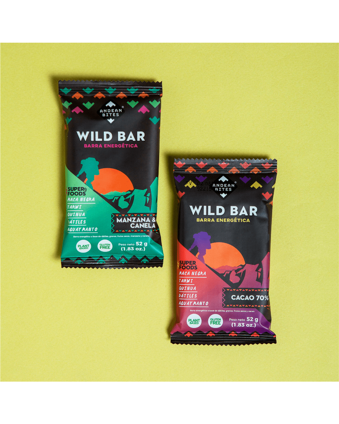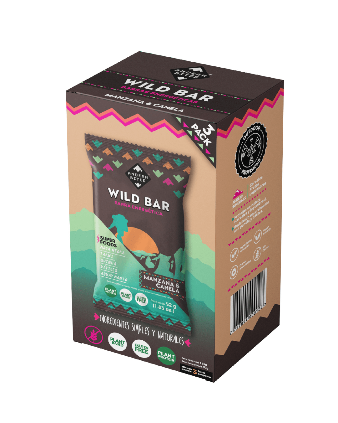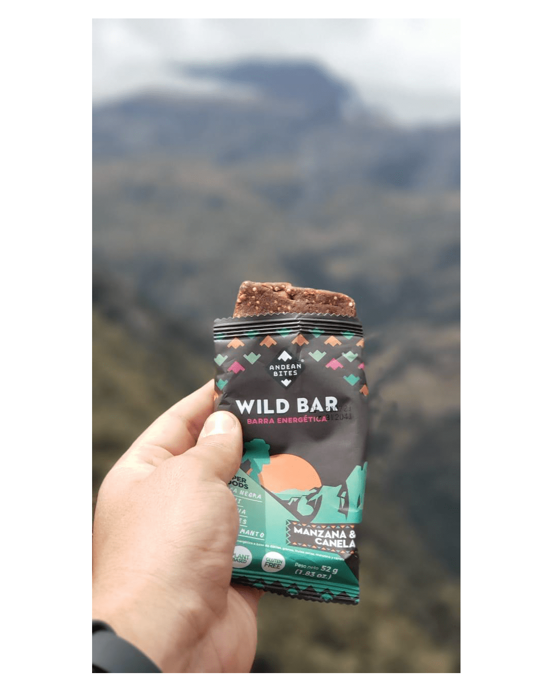 - La Wild Bar de manzana y canela de Andean Bites es elaborada con pulpa de manzana, dátiles orgánicos, panela orgánica, almendras orgánicas, quinua orgánica, avena orgánica sin gluten, harina de tarwi, harina de maca negra orgánica, canela, aguaymanto orgánico deshidratado, extracto de vainilla natural y sal de maras.